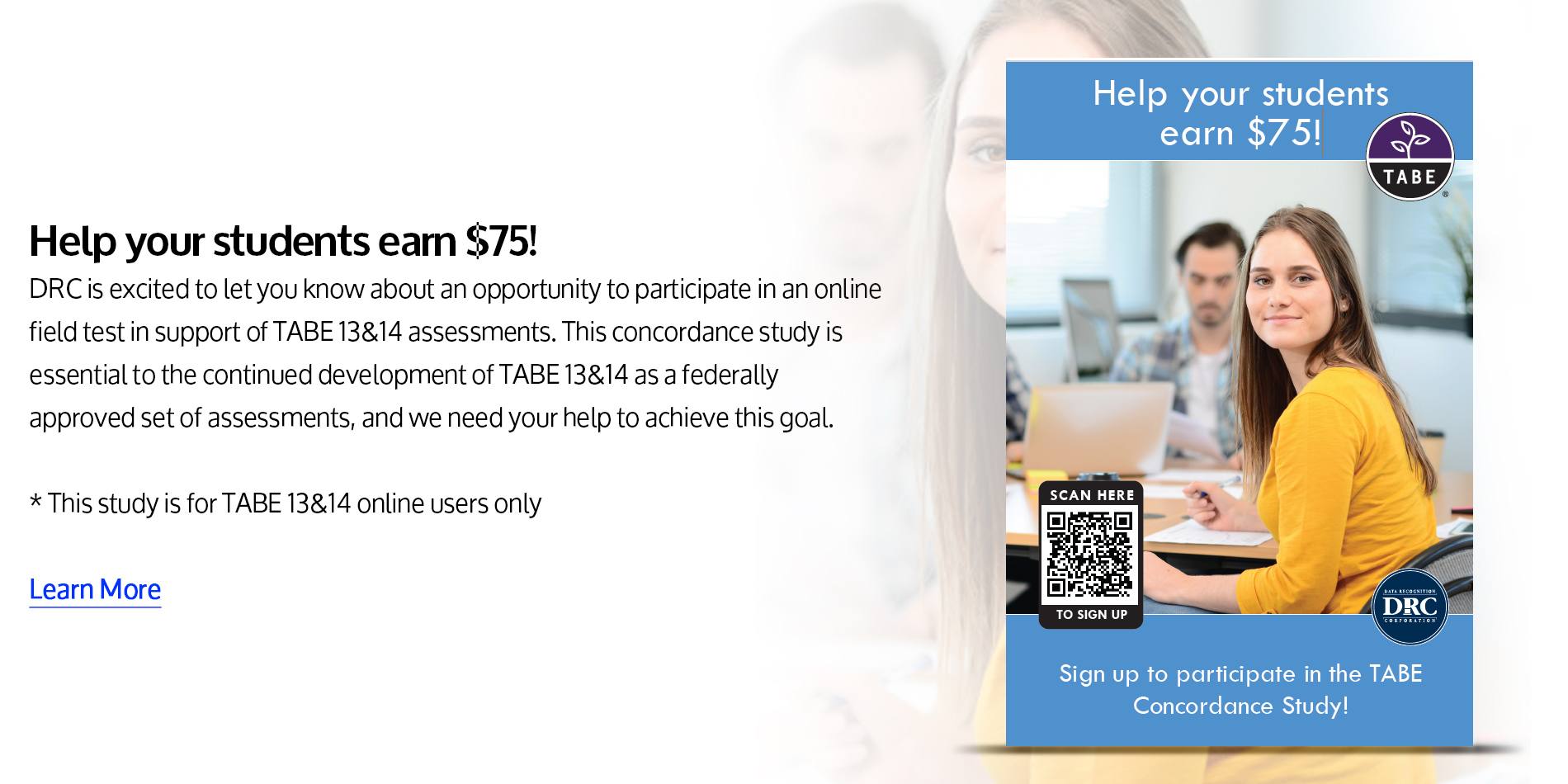 TABE Online is an easy-to-use, web-based assessment of adult basic and secondary education knowledge. Powered by DRC INSIGHT™, TABE Online is quicker, easier, and more convenient to administer and score, minimizing the paperwork and security risks associated with paper-based testing.Subject Areas
